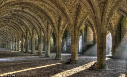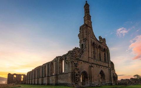 Vẻ đẹp cổ kính, tráng lệ của lâu đài Abbey bị bỏ quên ở North Yorkshire trong ánh bình minh.
