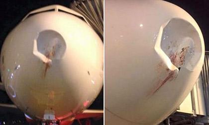 Hiện trạng máy bay Vietjet bị lõm sâu phần mũi do bị chim va vào. Ảnh: FB