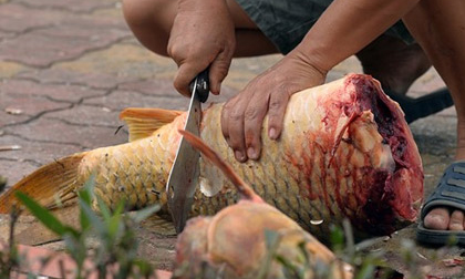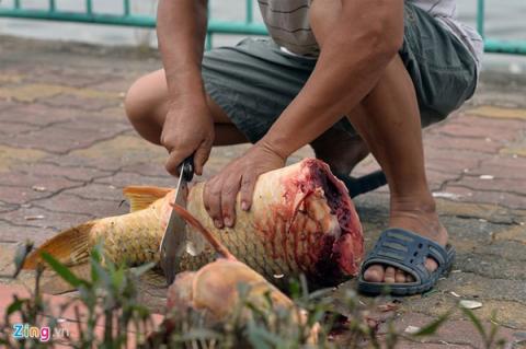 Một người dân vớt được con cá chép đã chết trên hồ Tây chiều 2/10 và xẻ thịt.