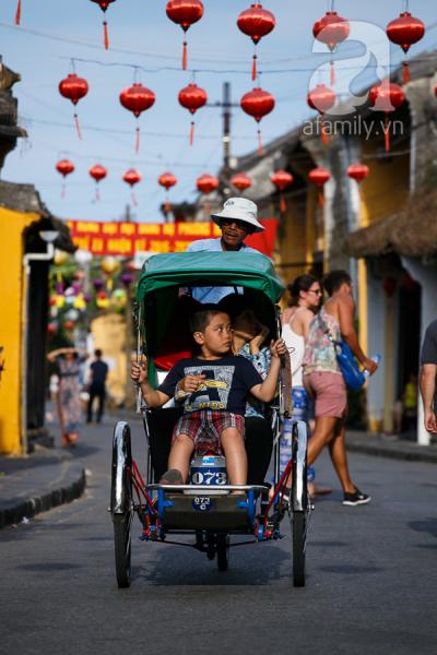 Một cậu bé tham quan phố cổ với mẹ trên xích lô