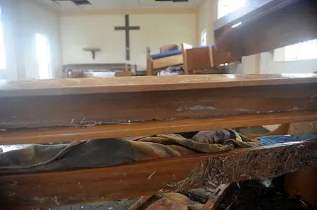 Nhiều thi thể nằm bất động bên lễ đường, mình dính đầy bùn đất.