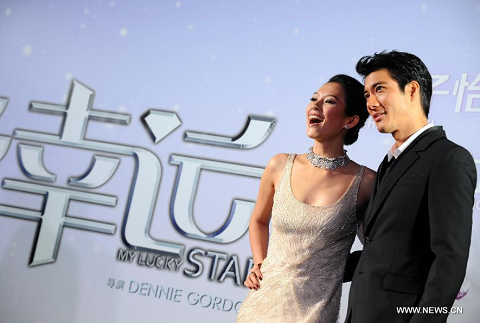 Chương Tử Di khoe dáng trong bộ váy trắng đính kim tuyến lóng lánh sánh vai bên trai đẹp Vương Lực Hoành trong buổi quảng bá phim My Lucky Star 2.