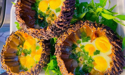 Đó chính là món nhum biển nướng cùng trứng và mỡ hành, thường được thấy ở Phú Quốc, Việt Nam.