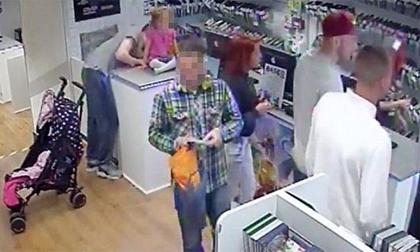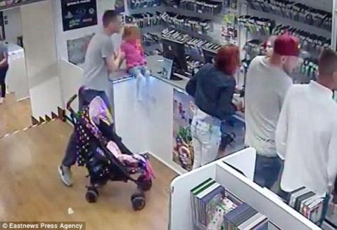 Đoạn video cho thấy người bố, ở nước Anh, đã nhấc cô bé ngồi lên trên kệ thanh toán tiền của cửa hàng điện thoại nhằm đánh lạc hướng nhân viên ở đây để anh ta thực hiện hành vi trộm cắp.