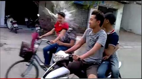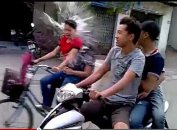 Ba thanh niên này không đội mũ bảo hiểm. Người ngồi giữa mang theo một thùng sơn đựng nước. Thanh niên ngồi sau cùng tay cầm một ca nước lớn. Khi gặp người đi xe đạp, thường là các thiếu nữ, các thanh niên này dùng ca múc nước và tạt thẳng vào mặt.