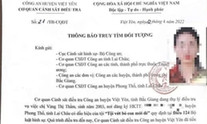 Ngày 12/4, Công an huyện Việt Yên phát thông báo truy tìm Vàng Thị Thắm để làm rõ hành vi vứt bỏ con mới đẻ.