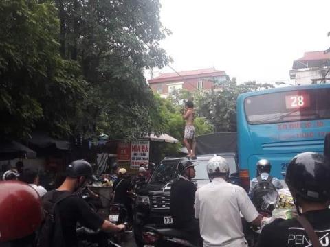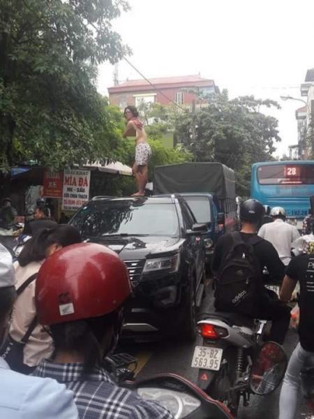 Thời điểm trên nhiều người lưu thông trên phố bỗng phát hiện cô gái leo lên nóc chiếc xe ô tô 7 chỗ màu đen hiệu Ford mang BKS: 30E.XXX đang dừng giữa lòng đường la hét, múa may với biểu hiện nghi bị ngáo đá.