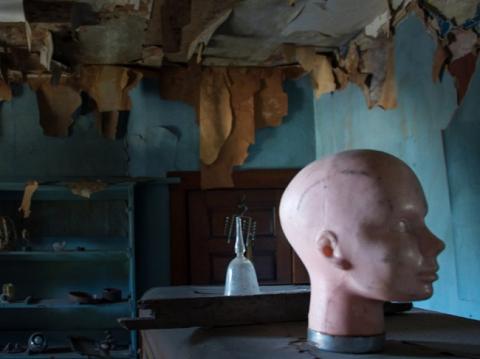 ma nơ canh được trưng bày gọn gàng trên kệ cùng với các công cụ y tế rỉ sét".