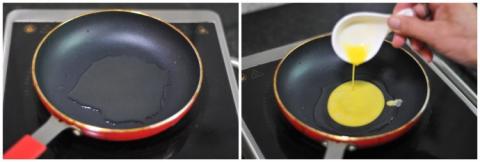 Đun nóng dầu ăn trong chảo, láng đều dầu trên mặt chảo. Múc từng muỗng trứng vào chiên.