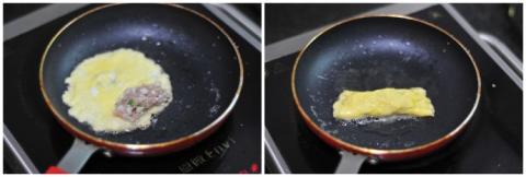 Khi bề mặt trứng se lại thì múc thịt băm đặt lên trên trứng và cuộn lại.