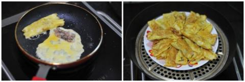 Bạn làm tương tự với phần thịt và trứng còn lại. Sau khi chiên xong cho trứng ra đĩa và cho vào nồi hấp, hấp cho đến khi thịt trong trứng chín là được.
