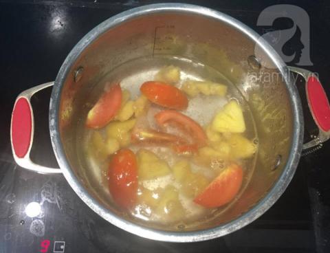 Tiếp tục phi thơm 1 thìa dầu ăn với ½ thìa thìa gừng tỏi còn lại, cho cà chua, dứa vào xào chung để tạo màu sắc đặc trưng của món canh chua rồi cho vào nồi một lượng nước vừa đủ. Cho 1 quả me vào đun chín nhừ.