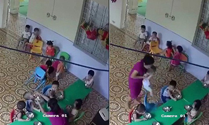 Hình ảnh camera giám sát tại phòng học cũng ghi lại cảnh nữ giáo viên mặc bộ quần áo màu tím liên tục nhồi nhét thức ăn vào miệng cháu B., khi bé nôn và khóc, cô giáo này tiếp tục lôi cháu ra cửa đánh.