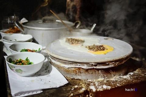 Đến với Hà Giang bạn cònđược thưởng thức món bánh cuốn trứng nóng hổi trên bếp.