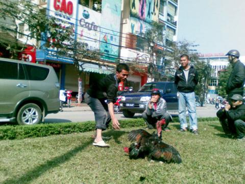 Chiều qua (15/3), rất nhiều người đi đường đã dừng xe lại để xem chọi gà trên đường Trần Thái Tông (đoạn gần ngã tư giao cắt Xuân Thủy - Trần Thái Tông - Cầu Giấy, Hà Nội).