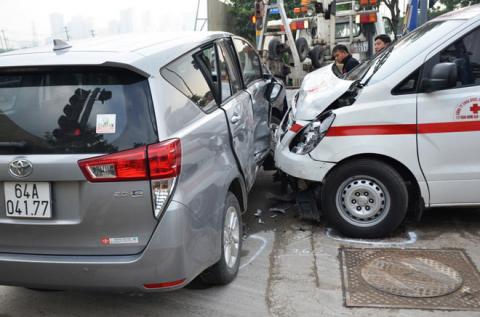 6h sáng nay, xe cứu thương biển số Phú Yên chở bệnh nhân lưu thông trên đại lộ Mai Chí Thọ, hướng từ xa lộ Hà Nội về hầm Thủ Thiêm, khi đến giao lộ Trần Não (quận 2, TP.HCM) thì va chạm vào ô tô 7 chỗ đang rẽ trái.
