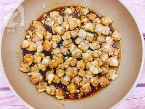 Đun nóng dầu, cho hành, tỏi băm vào phi thơm rồi cho ngao vào đảo đều.
