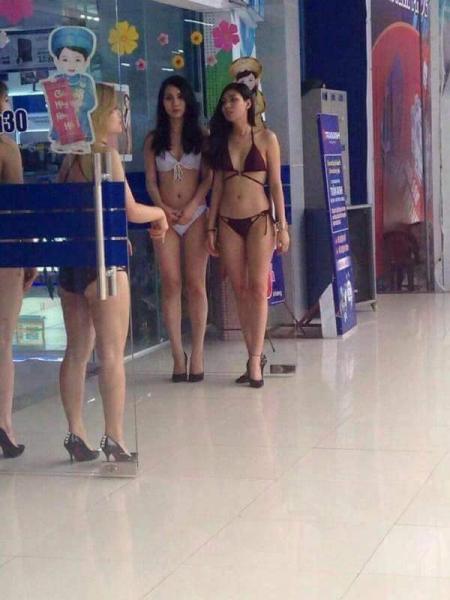 Dàn hot girl chân dài mặc bikini mát mẻ, đứng khoe thân trong siêu thị nhằm thu hút khách mua hàng và quảng bá các mặt hàng mùa nóng khiến cư dân mạng "nổ đom đóm mắt".