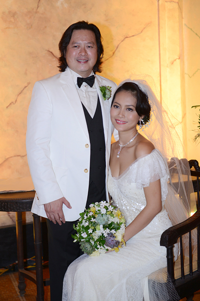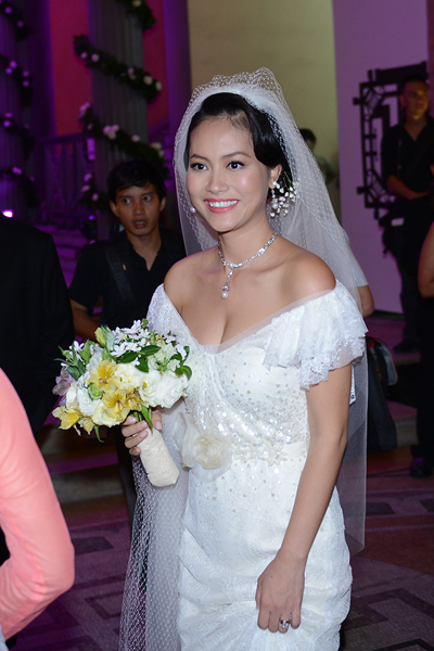 Trong bộ váy cưới trễ nải, tân nương khoe vòng 1 gợi cảm bên chú rể người Việt kiều Calvin Tài Lâm. Ông xã Đỗ Hải Yến là tổng giám đốc một công ty kinh doanh lớn. Cả hai yêu nhau 3 năm mới quyết định đi đến hôn nhân.