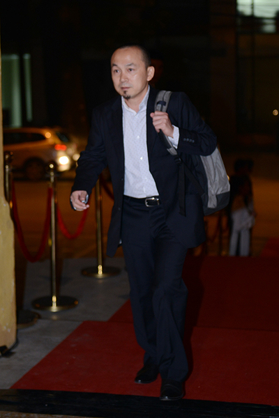 Nhạc sĩ Quốc Trung vội vàng đến tiệc cưới để chuẩn bị cho màn trình diễn nghệ thật.