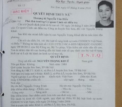 Ngày 7-4-2016, xác định Khuê đã bỏ trốn, Cơ quan CSĐT Công an huyện Sóc Sơn đã ra quyết định truy nã toàn quốc Khuê về tội giết người.