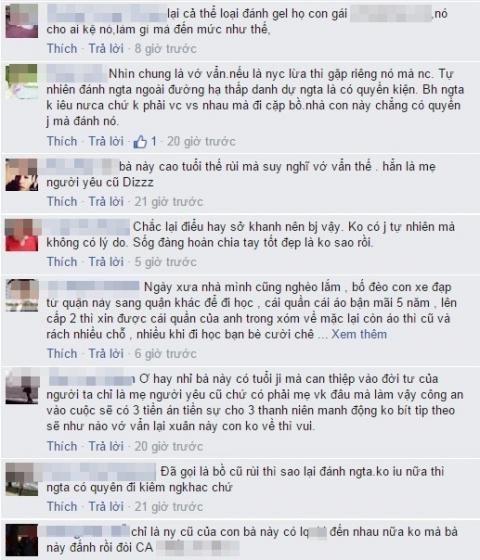 “Bà mẹ người yêu cũ của cậu này không ra gì. Sao bà không xem lại con gái mình? Mà chúng nó yêu rồi bỏ nhau bây giờ có gì là lạ chứ? Bà làm vậy cho bọn trẻ nó đánh nhau, bà ngồi cùng con gái có thấy sướng không? Nếu vụ này có thật, công an gọi bà này lên phường sẽ xử bà vì tội cố tình gây rối trật tự xã hội”, facebooker Liên Phạm bình luận.
