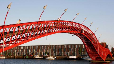 Cầu Python (Amsterdam, Hà Lan): Cây cầu đỏ lượn sóng dành cho người đi bộ của thủ đô Hà Lan này đã và đang làm những người yêu thích kiến trúc thích thú kể từ khi được xây dựng vào năm 2001. Và nếu ghé thăm vào một ngày hè, du khách sẽ được chiêm ngưỡng cảnh tượng người dân vui vẻ nhảy từ cây cầu cao 9m này xuống dòng nước mát bên dưới.