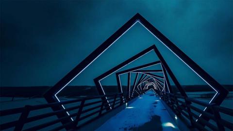 Cầu High Trestle Trail (Thung lũng sông Des Moines, Mỹ): Bắc qua Thung lũng sông Des Moines ở Iowa khoảng nửa dặm, cầu High Trestle Trail được thắp sáng lộng lẫy bằng đèn xanh mỗi đêm, với thiết kế độc đáo nhằm người đi trên cầu có cảm giác nhìn xuống một hầm mỏ.