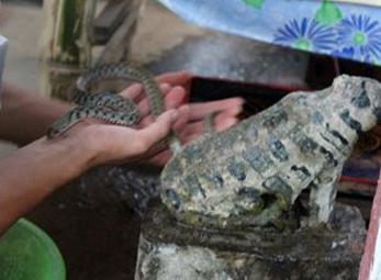 Người dân kể, đã có tới 3 con cóc xuất hiện, trong ảnh là con cóc vàng thường về “chơi, vui đùa với ngài rắn” (lời ghi trong tờ rơi). Và người dân không quên chụp lại ảnh.