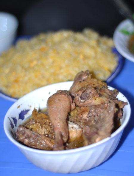 Đặt tên cơm đảo nghe có vẻ là lạ tai chứ thực chất nó không khác mấy so với món cơm rang quen thuộc. Có chăng chỉ là cơm ở đây vàng rộm màu của trứng, ít dầu mỡ, hạt gạo săn đều hơn do được đảo rất kĩ. Chẳng thế mà ở quán lúc nào cũng văng vẳng những âm thanh “lẻng xẻng, lẻng xẻng” không ngớt do nhân viên luôn tay đảo cơm. Nhưng thứ cơm đảo này có ngon hay không thì chủ yếu lại do món gà rang quyết định.