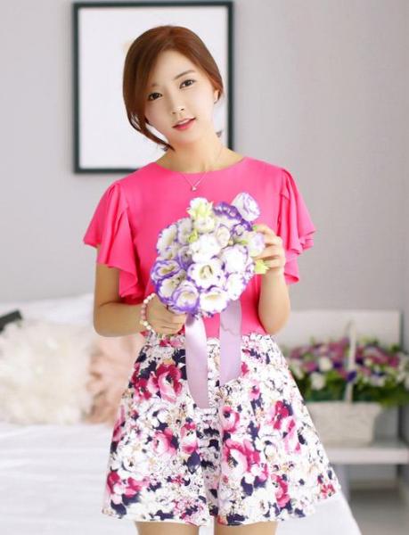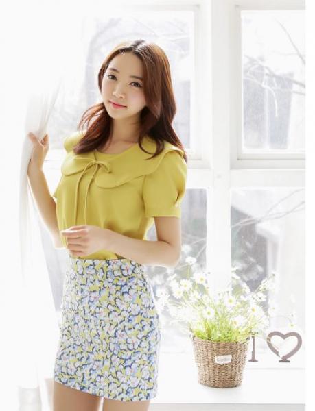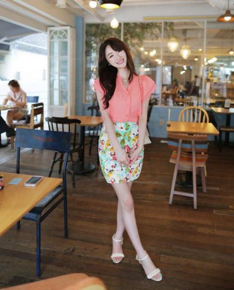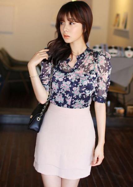 Sơ mi hoa nhí màu xanh mát mẻ phối cùng chân váy cùng tông