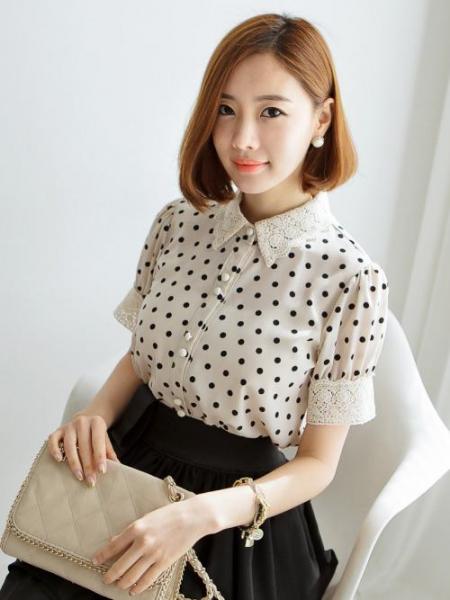 Cổ và tay áo đắp ren khiến sơ mi chấm bi có thêm nét thanh nhã