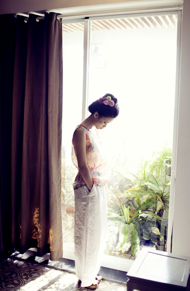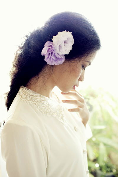 ... và lúc lại dịu dàng, nữ tính với hoa cài đầu, áo trắng họa thêu ren điệu đà trên cổ.