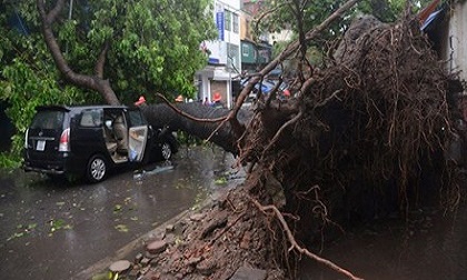 Cây bật gốc đè trúng ô tô trong bão số 1 năm 2016 ở Hà Nội. Ảnh: Zing.vn