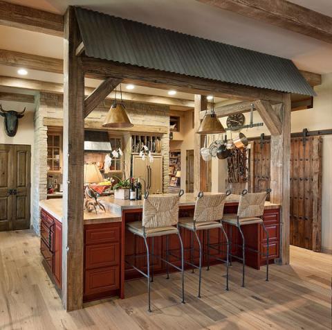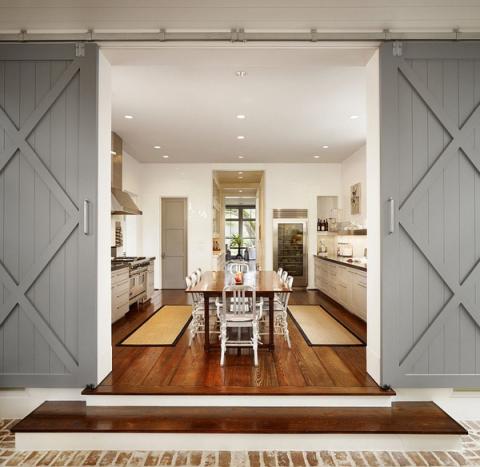 Phòng bếp truyền thống với cửa trượt gỗ lớn và nổi bật.