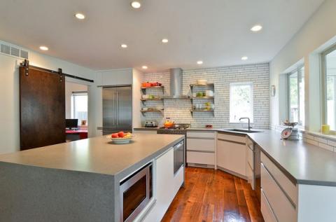 Phòng bếp hiện đại dùng cửa trượt để tăng thêm nét độc đáo cho tổng thể không gian.