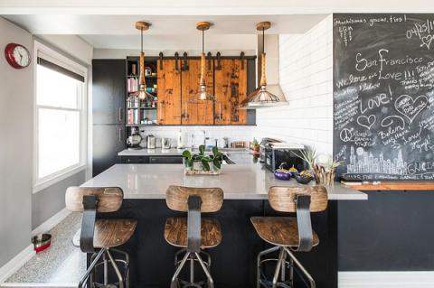 Bảng đen và cửa kéo là sự kết hợp hoàn hảo dành cho một phòng bếp vui nhộn.