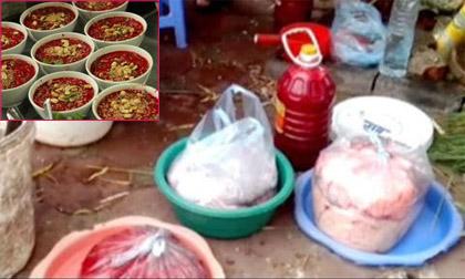 Qua khe cửa được làm bằng ván ép ngăn giữa khu vực nhậu với khu vực chế biến thức ăn, chúng tôi thấy người phục vụ quán chia nguyên liệu đã băm nhỏ vào từng chiếc bát, đĩa, sau đó thì đổ thêm phẩm màu, nước suối vào tiết canh rồi đánh đều, cho thêm nhiều bột ngọt rồi chế vào những bát, đĩa nguyên liệu đã chuẩn bị sẵn. Để tránh tình trạng tiết đông yếu hoặc đông lâu thì các chủ quán bỏ vào ngăn đá của tủ lạnh để ngay ở góc quán cho nhanh đông.