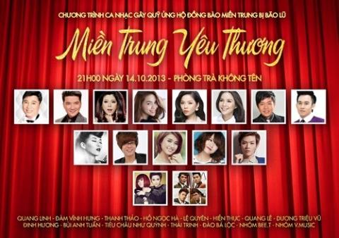 Chương trình Miền Trung yêu thương sẽ được diễn ra vào tối 21h ngày 14/10, tại phòng trà Không Tên. Toàn bộ nghệ sỹ tham gia đều là những tên tuổi hàng đầu hiện nay như Đàm Vĩnh Hưng, Quang Linh, Quang Lê, Lệ Quyên, Hà Hồ, Hiền Thục, Thanh Thảo,… cho đến những ca sỹ trẻ đang được đông đảo khán giả yêu mến như Dương Triệu Vũ, Đinh Hương, Bùi Anh Tuấn, Đào Bá Lộc, V.Music,…