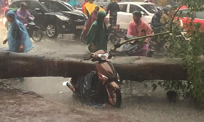 Mưa lớn kèm theo gió giật mạnh đã khiến hàng loạt cây xanh bị quật ngã trên các tuyến phố, nhiều người quăng bỏ xe máy giữa đường tìm nơi tránh trú.