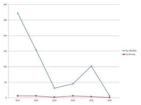 Biểu đồ số ca mắc và tử vong do bệnh viêm não mô cầu từ năm 2011-2016, theo số liệu Cục Y tế dự phòng - Bộ Y tế