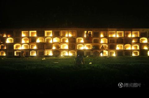 Ánh đèn trong khu nghĩa trang khi màn đêm buông xuống.