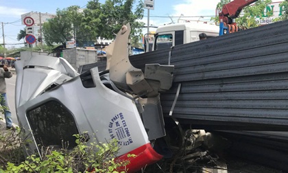 Xe container chở theo hàng trăm thanh đà thép lưu thông trên Quốc lộ 1A bất ngờ thắng gấp né phương tiện khác khiến các thanh thép đè bẹp cabin.