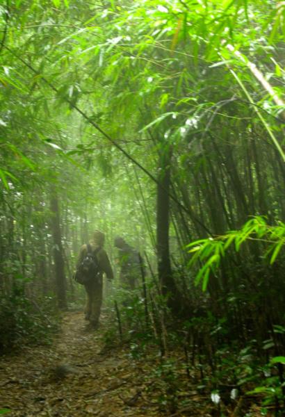 Xuất phát từ xã Bình Khê, chúng tôi mải miết bước trên những con dốc trơn như mỡ và rợn ngợp bóng trúc. Tuy mệt mỏi nhưng ai cũng động viên nhau gắng sức, bởi chuyến đi này chúng tôi còn mang theo một số đồ dùng cần thiết để biếu nhà chùa.