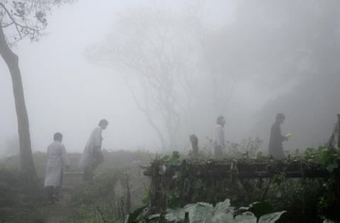 Phật tử và khách nghỉ chân cùng lên chùa dự giờ sám hối. Áo tràng xám phất phơ trên những bậc đá và ẩn hiện trong mây mù, nửa như thực, nửa như mơ.