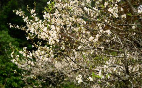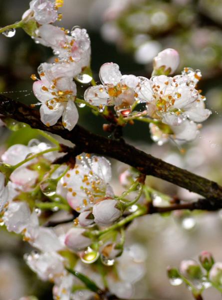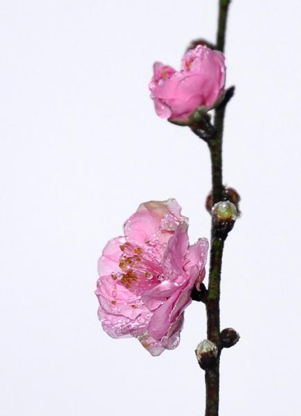Hoa đào, hoa mận bung nở trên những bậc đá dẫn lên am. Sương mai còn đọng lại trên cánh hoa, long lanh như những hạt ngọc.