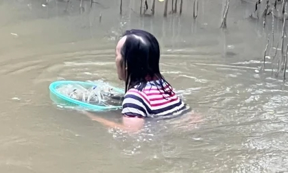 Nam danh hài đang đầm mình ra sông mò hến, với mái tóc dài và chiếc áo cũ kỹ.