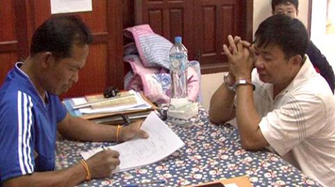 Công an tỉnh Bôlykhămxay lấy lời khai trùm Xiêng Phênh (phải). (Ảnh: Nguyễn Cường)