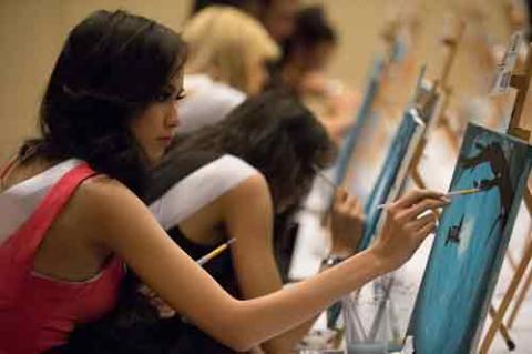 Dù không có khiếu vẽ tranh nhưng cô vẫn hào hứng tham gia phần thi.