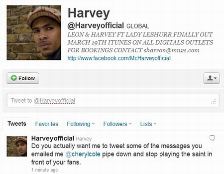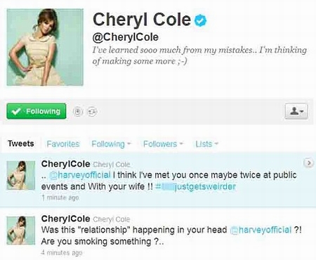 Ngay sau lời thổ lộ của MC Harvey, nữ ca sĩ 28 tuổi đã ngay lập tức viết trên trang Twitter của mình rằng cô đã rất bối rối bởi tin tức không có thật về chuyện tình cảm của mình. Cheryl phản pháo với ngôi sao rapper trên trang Twitter rằng: “Cái gọi là 'mối quan hệ mật thiết' mà anh sử dụng ở đây có nghĩa là gì thế? Đầu óc anh có vấn đề hay là anh bị hoang tưởng? Tôi mới chỉ gặp anh một hay hai lần gì đó, và lần nào cũng có vợ anh đi cùng”.